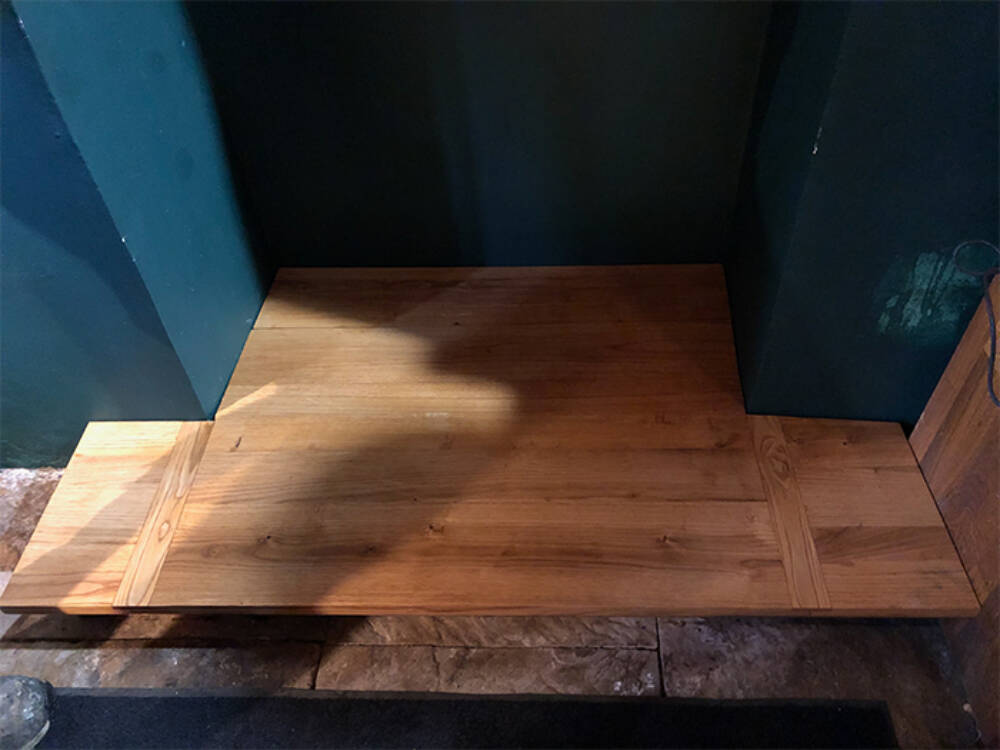 Dus heb ik me uitgeleefd op het eikenhout dat ik ooit ruw heb ingekocht: planken uitzoeken, recht afzagen, door de vandiktebank halen, lijmen, aan elkaar verbinden en passend maken in het zeer onregelmatige 'vak' van de haard. Geolied met speciale olie van Rubio, bijna in de kleur van het in de olie gezette hout van de keuken. Helemaal fijn, hartstikke mooi (al zeg ik het zelf) en ook best een beetje trots.