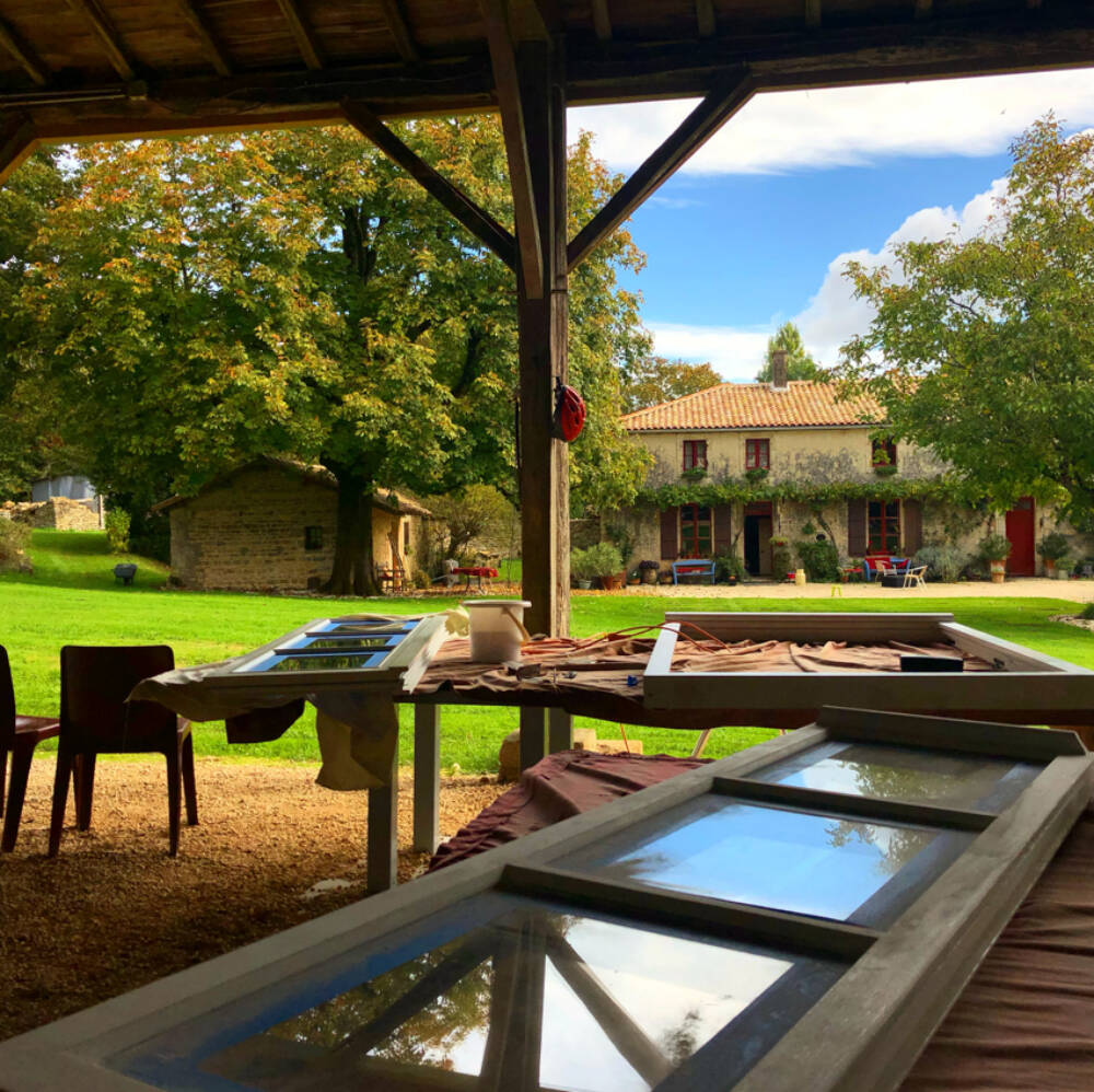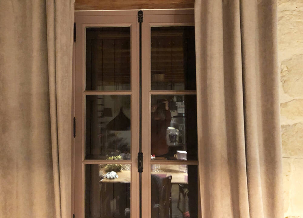 La fenêtre, de par sa transparence et son cadrage de vue se prête à l'embellissement : des fleurs sur le rebord, des rideaux jusqu'au sol, la juxtaposition des matières. Et puis, l'endroit des rituels : prendre un café du matin sur le banc bleu, un apéritif le soir avec vue sur la cour, voir les lavandes fleurir par la fenêtre du gîte...
