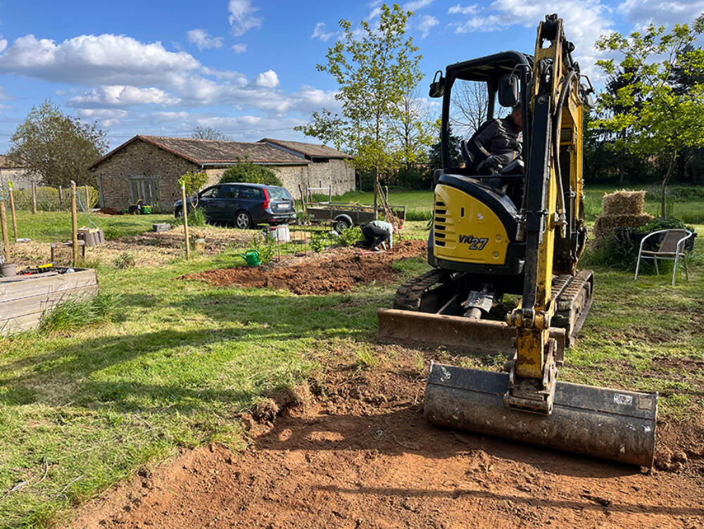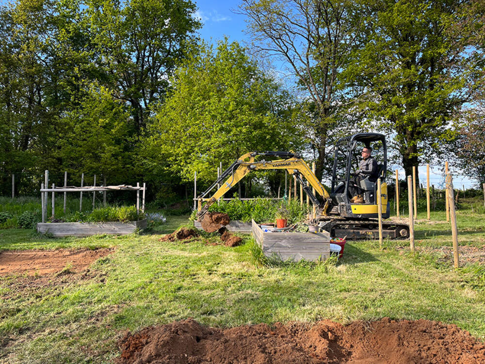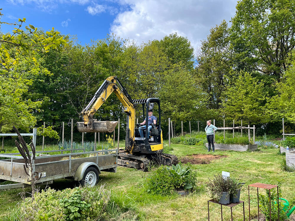 En omdat niet alle kwadranten even groot zijn, voorzagen we ruimtetekort bij het vierde (en straks weer bij het eerste) kwadrant. Dus toen de graafmachine er toch was... werden de cirkels geruimd en hebben we er een extra rechthoekig stuk bijgemaakt. "We", dat waren deze keer (weer) Menno (op de graafmachine!), Jochem, Marielle, Fleur en Amber: samen hebben we superhard gewerkt en waren we ook supertevreden met het resultaat.