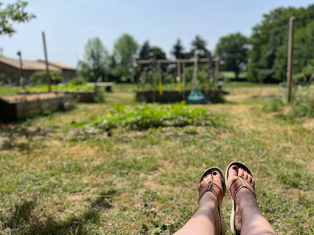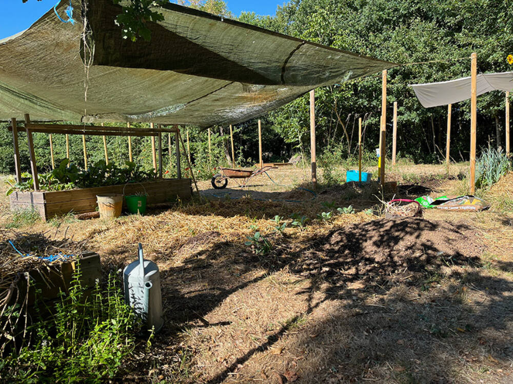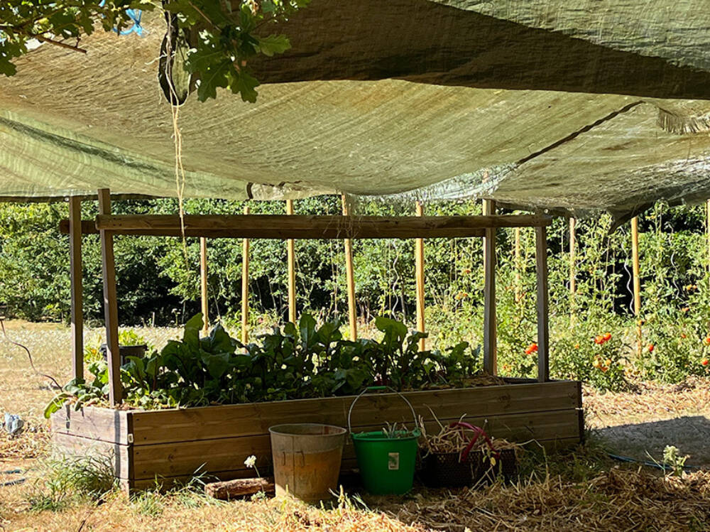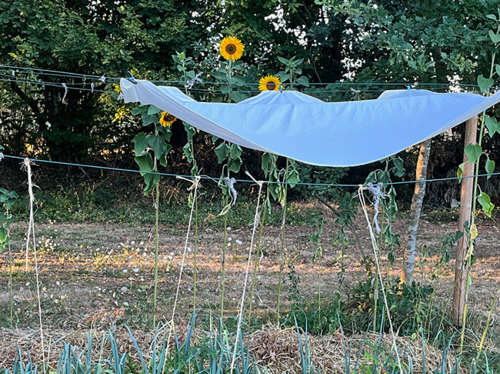 Een bijkomend voordeel van de palen met draden ertussen: je kunt er lappen op vastzetten met wasknijpers, om je gewassen tegen de te hete zon te beschermen. Dat werkte uitstekend, en gaf ook de gelegenheid om in de schaduw met een kopje koffie van de tuin te genieten. En het zag er ongelofelijk zomers en zuidelijk uit.