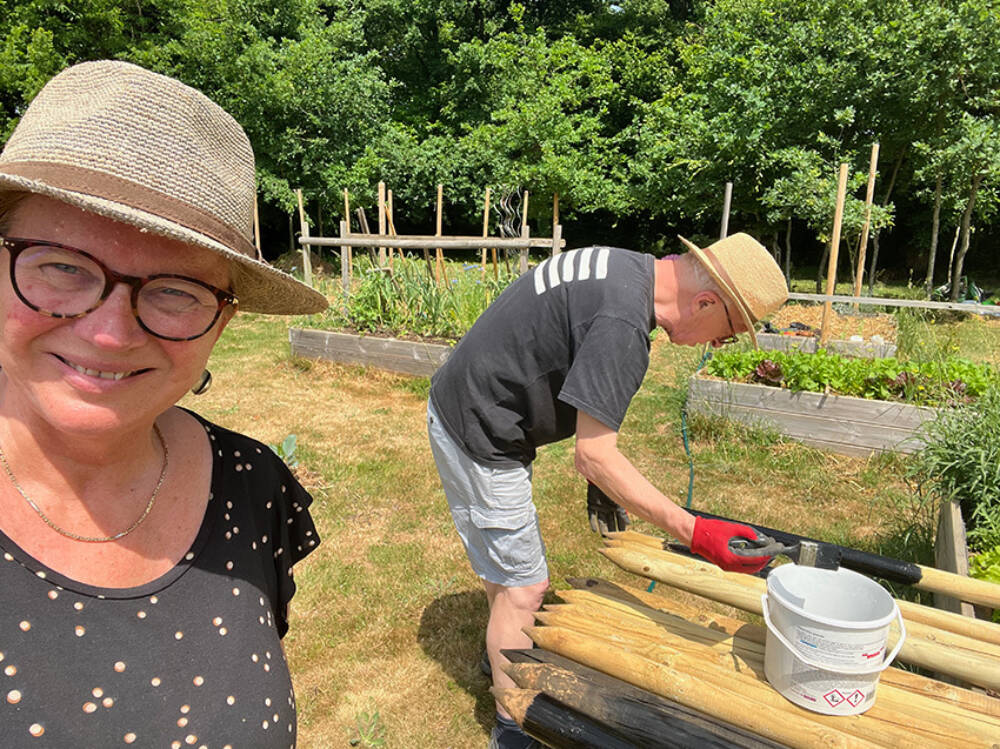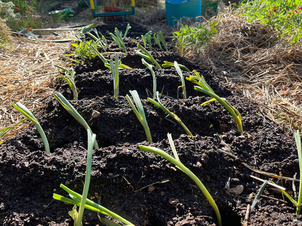 Dat tweede jaar kwam ook Michel langs, en die had gewerkt in een tomatenkwekerij. Hij kwam met het geweldige plan om hoge palen aan de uiteinden van de bedden te zetten, daar dan metaaldraad tussen te spannen en vanaf die draden touw naar de grond te leiden. De tomatenplanten kun je daar omheen draaien: dat scheelt een hoop gedoe met touwtjes aan paaltjes én je planten worden hoger, en geven dus een betere opbrengst.
